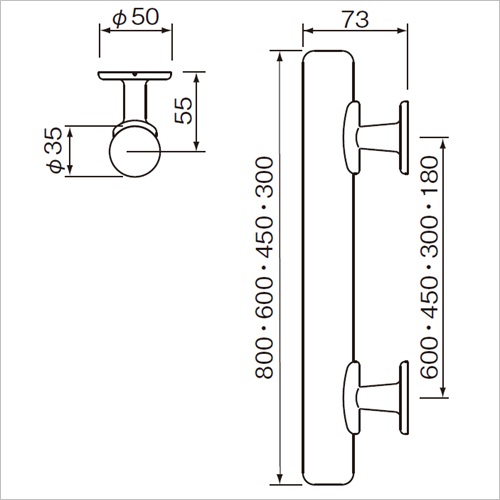 [サイズ]Φ35mm×600mm [本体重量]620g [付属品]スチール十字穴付皿木ネジA形4×40:4本 [材質]自然木・亜鉛合金 ●耐荷重 取付ピッチ910以内:120kgf 【ご注意】耐荷重的に、縦使いでご使用ください。
