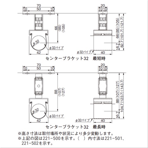 ・クローゼットパイプの中間部下がり防止にご利用いただけます。 ・台座にパイプ受けをセッティングする構造により、既設のハンガーパイプに後から取付けることが可能になりました。 ・約20mmの範囲で自在に高さ調節ができます。 ・台座が回転するので、タテ・ヨコどちらの方向でも取付けることができます。 [サイズ]表記による [本体重量]133g [付属品]SUS十字穴付皿タッピンネジ 4×25:2本 [材質]SUS304 [仕上]バレル研磨 ●備考:φ32パイプ用 ●耐荷重:50kgf