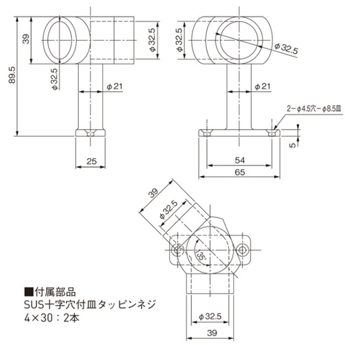 [サイズ]65x39x89.5mm [本体重量]392g [付属品]SUS十字穴付皿タッピンネジ4×30:2本 [材質]ZDC [仕上]クロームメッキ [適用パイプ径]φ32