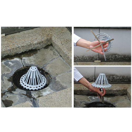 ドレインに差込むだけの、改修専用ストレーナーキャップです。 建物の屋上やマンションのべランダなど、排水溝のゴミが排水口に流れ、詰まってしまうのを防止する網状のキャップです。 屋上防水改修工事の際に改修用ドレインを使う場合は、従来のストレーナーキャップではほとんど利用できないため、改修専用のものが必要になります。 ポリカーボネート製で錆の心配が無く、難燃性・耐候性・耐衝撃性に優れ、コストパフォーマンスの高い商品です。 (ライトグレー色)ドレインに差し込むだけの簡易設置施工です。 弾性の強いステンレス製の脚が排水口にしっかり刺さり固定します。 目詰まりしにくいシンプルな形状で、適応パイプ径に対し、フレキシブルに対応します。 横型は、パイプ径に合わせて脚の位置をスライドさせることで任意の位置に調節可能です。 [本体重量]175g [材質]ポリカーボネート・SUS304 ●適応パイプ呼び径:φ75〜φ150