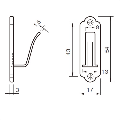 カーテンの房を掛ける金物です。 [本体重量]15g [付属品]SUS十字穴付丸皿木ネジ2.4×13:2本 [材質]SUS304 [仕上]ヘアーライン ●耐荷重:10kgf