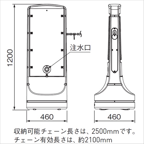 付属のチェーンで簡単に仕切りができます。 S字フック付き。 本体とチェーンの連結可能。 収納可能チェーン長さは 2500mm、チェーン有効長さは 約2100mmです。 [本体色]イエロー [サイズ]H1200mm×W460mm×D460mm [重量]6.8kg [材質]ポリエチレン樹脂 [水満量時重量]約57.6kg