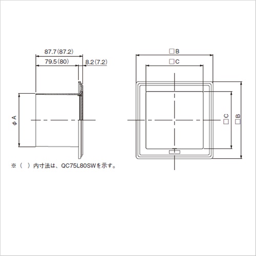 スマートなフォルムを追求したデザインで、本ページ下の角型レジスターと意匠面で統一性が図れます。 壁からの出寸法(8mm)をできるだけ少なくし、フラット感を強調し、また、エッヂに段を付けることにより、アクセントとシャープさを演出しました。 前面パネル(蓋)の取外しは、マイナスドライバー1本で可能です。 断熱材等による躯体と室内パネルとの隙間を考慮し、本体スリーブ長を80mmと長くしました。 [サイズ]A:73.7、B:114、C:82 [本体重量]59.5g [材質]ABS [色]ホワイトグレー ●適用