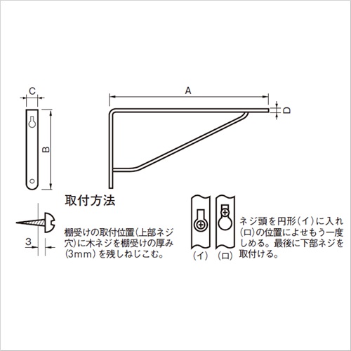 [サイズ]A90mm、B45mm、C13mm、D2mm [本体重量]35g [付属品]SUS十字穴付丸木ネジ 3.0×14:2本 3.5×22:2本 [材質]SUS304 [仕上]ヘアーライン [耐荷重]25kgf
