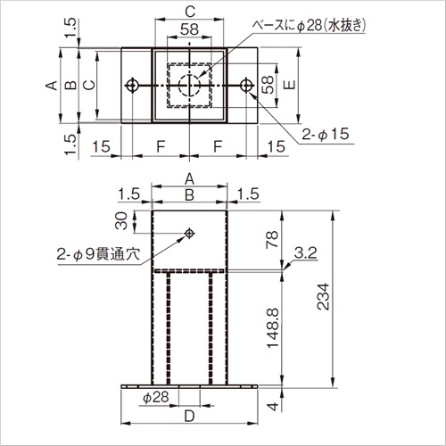 ・水抜き穴があるので柱の腐食を防止します。 ・ボルトタイプは座に穴明け加工を施していますのでアンカー止めが可能です。