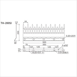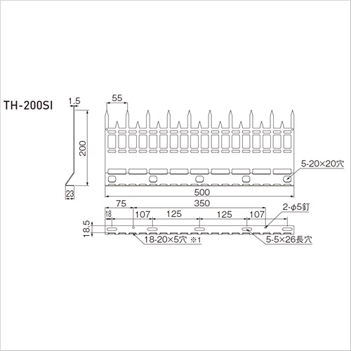 [サイズ]高さ200mm、幅500mm、奥行23mm、剣ピッチ55mm、厚み1.5mm [重量]740g [材質]SUS304 [防犯金具アムレットシリーズは組み合わせることで用途が広がります] ・TH-200SIは単独でもご使用いただけますが、TH-500SA(別売)と組み合わせての使用も可能です。 ・SUSアムレットバンド用部品上下セット(TH-OF・TH-800B 各2個ずつ)(別売)を使ってパイプに取り付けも可能です。(※穴を通して取り付けます)