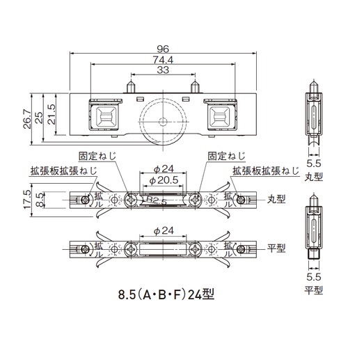 ・上下調整可能でアルミサッシに適合します。 ・窓・テラス(複層ガラス入)などにご使用いただけます。 [サイズ]H28mm×L96mm×D8.5mm [重量]53g [材質]車:ポリアセタール 軸受:DBブッシュ ●コマ形状:Φ24丸 ●耐荷重 2個使用時:20kgf
