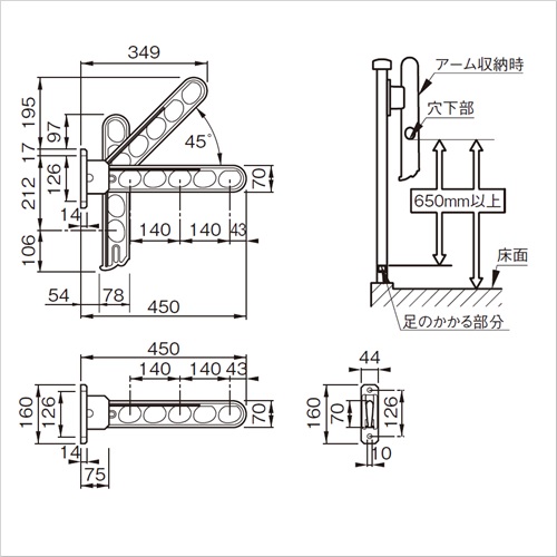 ・機構(公団)住宅AE-504、公共住宅仕様E-405該当品は、ポールとセットした場合のみです。 ・手すり乗り越え危険防止のため、収納時における穴下部が足のかかる部分より650mm以上になるように取付けてください。
