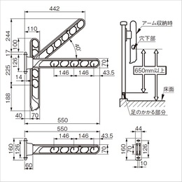 ・機構(公団)住宅AE-504、公共住宅E-405該当品は、ポールとセットした場合のみです。 ・手すり乗り越え危険防止のため、収納時における穴下部が足のかかる部分より650mm以上になるように取付けてください。