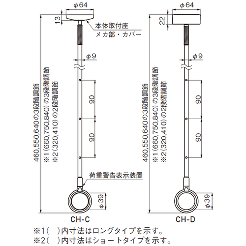 ・ポールは簡単ワンタッチ脱着式で、使用しない時は外しておけます。(フック付) ・長さが3段階に調節可能です。 ・天井裏の野縁材、軽天材にネジ2本で取付け可能です。 ・グッドデザイン賞受賞/キッズデザイン賞受賞 ・ポールを2本まとめて掛けられるフックが付属しています。 ・荷重警告表示装置付きです。 ・天井を傷めない安心機構です。