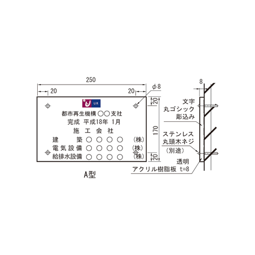 ・民営賃貸用特定分譲住宅の場合は左記にかぎりません。 ・表示文字は、丸ゴシックの彫込みとなります。(色は黒) ・文字の彫込みは裏彫りとなります。 ・周辺は面取りとなります。 ・建設工事の場合の施工会社名は、当該工事を直接請け負う業者名(元請負業者)のみ記入します。