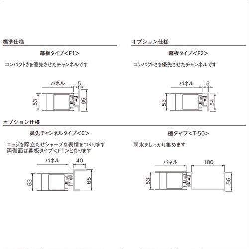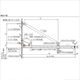 ・最小のパブリックスペースを確保する高剛性・軽量・高平滑性に優れたコンパクトサイズの庇です。 【規格最小パネルサイズ1200×2000】 ・規格化されたアルミ接着ハニカムパネルの採用で、低コスト、短納期を実現しました。 ・凹凸のないすっきりとした軒下空間を創り、2~3本の斜材で長さL寸法2000~6000までを支持することが可能です。 ・ディティールにこだわったブラケットデザインや、幕板をはじめとする機能別のオプションもご用意しております。 [品番/呼称]AS-1250 [サイズ]W1200mm、L5000mm、t53mm [重量]85kg [材質]アルミ [仕上げ]フッ素樹脂焼付塗装 [ご注意] ・価格にはハニカムパネル本体・幕板・水切・斜材・躯体側ブラケット・パネルブラケット・六角ボルトを含んでおりますが、アンカー・シーリング材は含まれておりません。 ・規格品以外の特殊寸法、特殊納まり寸法は、受注生産となります。お問い合わせください。 ・オプション部品の鼻先チャンネルタイプ及び樋タイプのチャンネル、樋の取付けは先端先側のみです。両側面は幕板タイプ(F1)です。 樋は両端で垂れ流しとなります。(両端蓋はありません)詳しくはお問い合わせください。 ●斜材(本):3 ●取付寸法:(1)800mm、(2)700mm、(3)100mm、(4)400mm、 ●仕様:表裏面板:アルミニウム板A3004P 表面処理:フッ素樹脂焼付塗装 パネル用接着剤:弾性シリコーン系接着剤 枠・幕板・水切:アルミ押出形材A6063S 斜材:SUSヘアライン仕上げ コア材:アルミ箔 A3003H 許容荷重:耐風圧3000N/平方メートル以下 積雪1m以下