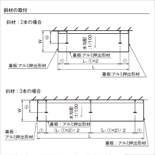 ・最小のパブリックスペースを確保する高剛性・軽量・高平滑性に優れたコンパクトサイズの庇です。 【規格最小パネルサイズ1200×2000】 ・規格化されたアルミ接着ハニカムパネルの採用で、低コスト、短納期を実現しました。 ・凹凸のないすっきりとした軒下空間を創り、2~3本の斜材で長さL寸法2000~6000までを支持することが可能です。 ・ディティールにこだわったブラケットデザインや、幕板をはじめとする機能別のオプションもご用意しております。 [品番/呼称]AS-2040 [サイズ]W2000mm、L4000mm、t53mm [重量]110kg [材質]アルミ [仕上げ]フッ素樹脂焼付塗装 [ご注意] ・価格にはハニカムパネル本体・幕板・水切・斜材・躯体側ブラケット・パネルブラケット・六角ボルトを含んでおりますが、アンカー・シーリング材は含まれておりません。 ・規格品以外の特殊寸法、特殊納まり寸法は、受注生産となります。お問い合わせください。 ・オプション部品の鼻先チャンネルタイプ及び樋タイプのチャンネル、樋の取付けは先端先側のみです。両側面は幕板タイプ(F1)です。 樋は両端で垂れ流しとなります。(両端蓋はありません)詳しくはお問い合わせください。 ●斜材(本):3 ●取付寸法:(1)650mm、(2)1250mm、(3)100mm、(4)720mm、 ●仕様:表裏面板:アルミニウム板A3004P 表面処理:フッ素樹脂焼付塗装 パネル用接着剤:弾性シリコーン系接着剤 枠・幕板・水切:アルミ押出形材A6063S 斜材:SUSヘアライン仕上げ コア材:アルミ箔 A3003H 許容荷重:耐風圧3000N/平方メートル以下 積雪1m以下