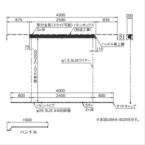 [品番/呼称]BKK-4025 [重量]9.5kg [バトン棒]Φ25 BL=4000mm [吊点数]2点 [許容積載荷重]10kg [標準ストローク]2.5m [適用ボックスサイズ]200mm×200mm×4300mm