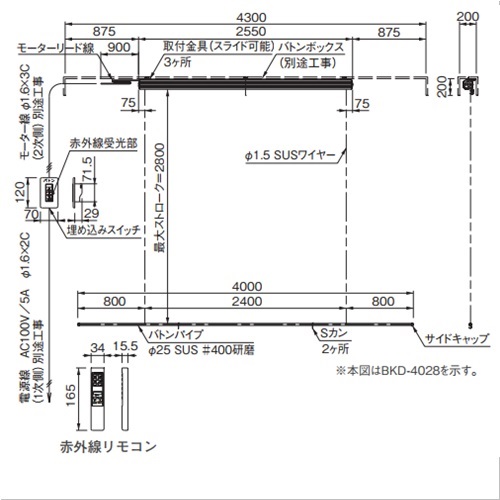 [品番/呼称]BKD-4028 [重量]13.0kg [バトン棒]Φ25 BL=4000mm [吊点数]2点 [許容積載荷重]15kg [標準ストローク]2.8m [適用ボックスサイズ]200mm×200mm×4300mm