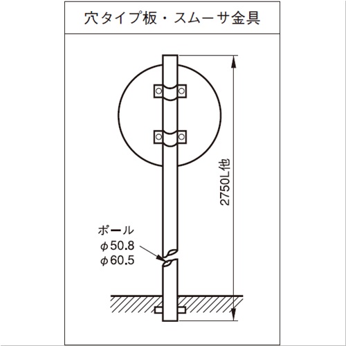 ・消防水利は、消防法施行規則第34条の2、別表1-の4に適合する標識です。 ・消火栓・防火水そうは消防法第442号通達に適合する標識です。 [品番/呼称]E-2 [サイズ]Φ575mm [重量]1.8kg [材質]電気亜鉛メッキ鋼板 [仕上げ]メラミン焼付 ●支柱の止め方法:スムーサー仕様