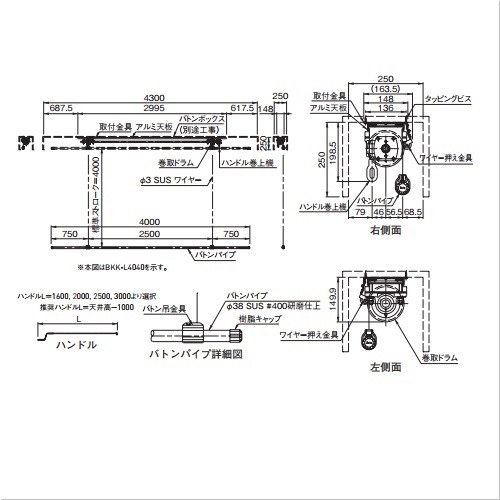 [品番/呼称]BKK-L4040 [重量]27.0kg [バトン棒]Φ38 BL=4000mm [吊点数]2点 [許容積載荷重]20kg [標準ストローク]4.0m [適用ボックスサイズ]250mm×250mm×4300mm