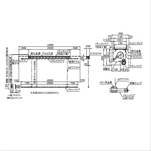 [品番/呼称]BKD-LE3040 [重量]21.1kg [バトン仕様]Φ38 BL=3000mm [吊点数]2点 [許容積載荷重]20kg [標準ストローク]4m [適用ボックスサイズ]200mm×200mm×3300mm [制御]DC24V