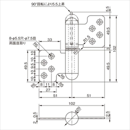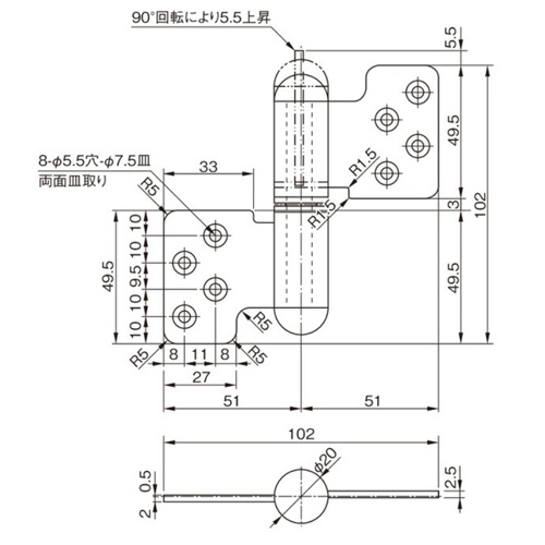 トイレの扉にご使用いただけます。 せり上がるタイプの丁番です。 軸の樹脂部品を差し替えると、開く角度や、内開き外開きの設定が簡単に変えられます。 開放式または自閉式にすることができます。 [サイズ]表記による [本体重量]347g [付属品]SUS十字穴付皿タッピンネジ A3.5×25:8本 [材質]SUS304・ナイロン・ポリアセタール・ポリプロピレン・SUS [仕上]ヘアーライン 【ご注意】扉がせり上がるため、その分のスペースが必要です。現場の状況により戸じゃくりを広げる必要も出てきます。
