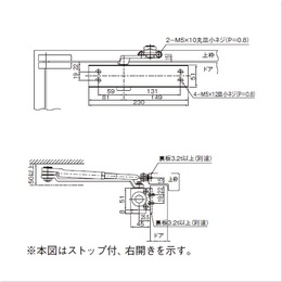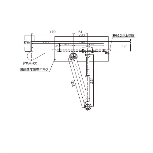 シャープなデザインでコンパクト設計。 取り付けネジが露出しないので外観がスッキリします。 ストップ角度は70°〜 120°までの任意の角度に設定可能です。 [適応ドア寸法]W950mm、H2100mm ●タイプ:スタンダード型 ●ドア重量 kg以下:65