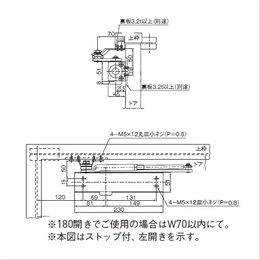 シャープなデザインでコンパクト設計。 取り付けネジが露出しないので外観がスッキリします。 ストップ角度は70°〜 180°までの任意の角度に設定可能です。 [適応ドア寸法]W950mm、H2100mm ●タイプ:パラレル型 ●ドア重量 kg以下:65