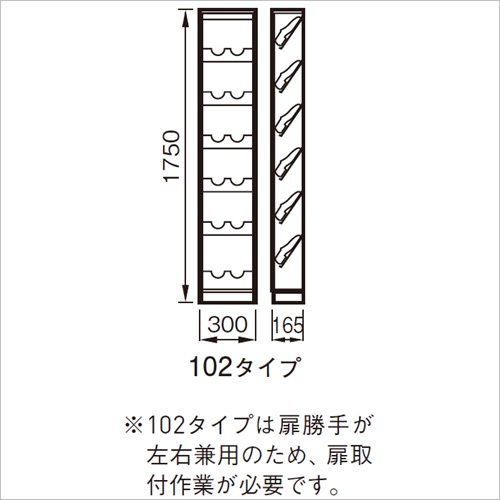・奥行きわずかの薄型設計で、マンションやアパートなど狭い玄関スペースに最適です。 ・壁に埋め込んで使える奥行きわずか165mmの超薄型をはじめ、通常タイプ品に比べ1/2以下の薄さです。 ・完成品のため、組み立てる手間がかかりません。扉は商品間口寸法内で回転するので、両サイドにスペースをとる必要がありません。 [色]アイボリー [サイズ]H1750mm、W300mm、D165mm [重量]15kg [材質]扉とカウンター:変性ポリエステル板 側板:化粧合板 内装:化粧合板 [ご注意] ・102タイプは扉勝手が左右兼用のため、扉取付作業が必要です。 ・運搬諸経費は別途お問い合わせください。 ●備考:6足用