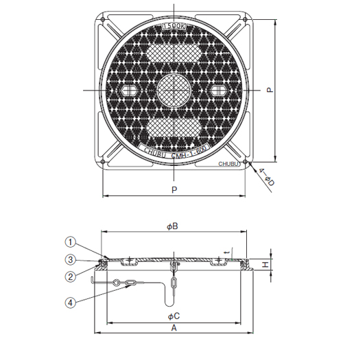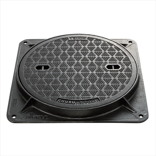 雨の日でもアスファルト舗装材に劣らない滑り止め効果を実現した安全性が高いマンホールカバーです。 空気調和・衛生工学会規格(SHASE-S)該当品です。 簡易密閉型(パッキン付き)です。 クサリ付きです。 指定マーク及び文字の鋳出しが可能です。 [サイズ]560x560x50mm [本体重量]33.4kg ●安全荷重:5103kgf ●部材仕様:(1)名称:フタ 材質:FC200 (2)名称:枠 材質:FC200 (3)名称:パッキン 材質:クロロプレンゴム (4)名称:クサリ 材質:SS400