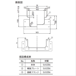 使用環境に合わせてパーツを自由に組み合わせることができます。 食品屑が付着しにくく、清掃しやすい形状です。 水勾配は1/200です。 [サイズ]W:178mm、W1:154mm、W2:100mm、W3:260mm、L:1500mm [材質]SUS304 [仕上]ヘアーライン ●部品構成表:(1)名称:本体 材質:SUS304 (2)名称:補強プレート 材質:SUS304 (3)名称:接続フランジ 材質:SUS304 【ご注意】運賃、施工費は別途です。h寸法は水下寸法150mmを基準とし、ご注文ごとに対応致します。h寸法116〜150mmは別途見積もり致します。集水桝のご注文の際は、流入方向をご指示ください。流入口は別途見積もり致します。標準品以外も製作可能です。