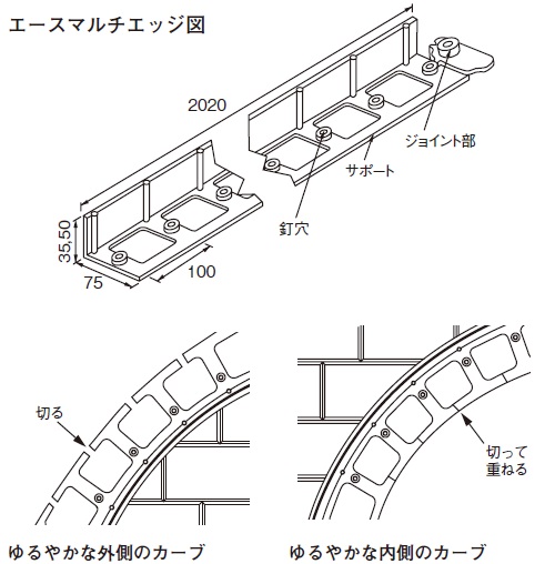 エースアルミエッジのスパイク固定ピッチは直線部は300mm、曲線部は100mmが目安です。