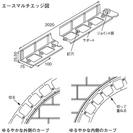 エースマルチエッジの釘固定ピッチは、車寄せ・屋敷内車道の場は300mm(7本使用)、遊歩道の場合は600mm(4本使用)が目安です。 エースアルミエッジのスパイク固定ピッチは直線部は300mm、曲線部は100mmが目安です。