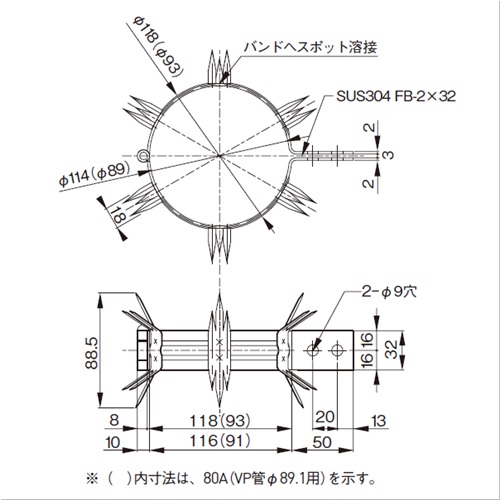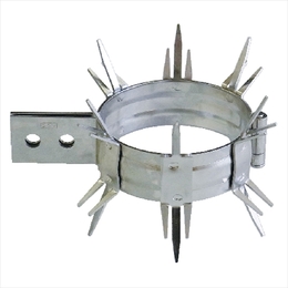 塀やフェンス上の忍び返しと同様に、ドレンパイプに設置できる威嚇バンドです。 樋バンド用の樋足を用いて取付けられます。 ドレンパイプ(縦樋)からよじ登っての侵入者を阻止します。 [本体重量]415g [付属品]SUSナベ小ネジ M8×25:2本 SUS六角ナット M8用:2本 [材質]SUS304 [仕上]電解研磨 ●管外径(VP管):φ114.3 【ご注意】設置には樋足との組合せが必要です。SUSツバ付樋足(前ページ)をご使用ください。