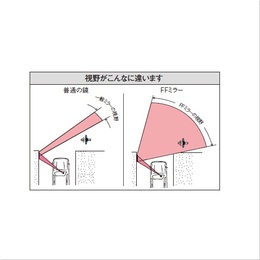 ・室内・屋外で使用可能です。 ・FFミラーはフラットなのに視野が広い不思議なミラーです。出っ張らないので違和感のないデザイン。目線と同じ高さに取付けられるので、自然と安全確認ができます。素材は耐衝撃性、耐候性に優れたプラスチック。割れにくく、長寿命の安心設計です。