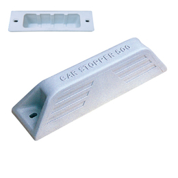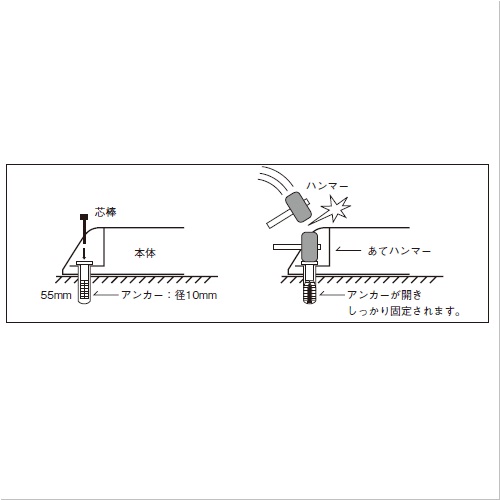コンクリート下地用ならその日のうちに使用できます。 長年の使用に耐えるプロ用の肉厚成形製品です。 高さ120mmの安全設計です。 カーストッパーST-500A(コンクリート下地):Aタイプ適用車両2tトラックまで コンクリート下地にオールアンカーで、しっかり固定します。 取付けたいコンクリート面にドリルで穴開けをします(ドリル穴:径10.5〜11.0mm深さ55mm以上)。 穴のまわりのゴミを取除きアンカーを本体に通し、地面に設置します。 芯棒をアンカーに打ち込み固定します。 [サイズ]H120mm、L500mm、D130mm [本体重量]2.7kg [付属品]芯棒打込式おねじタイプ スチールオールアンカー1080:2本 [材質]合成樹脂