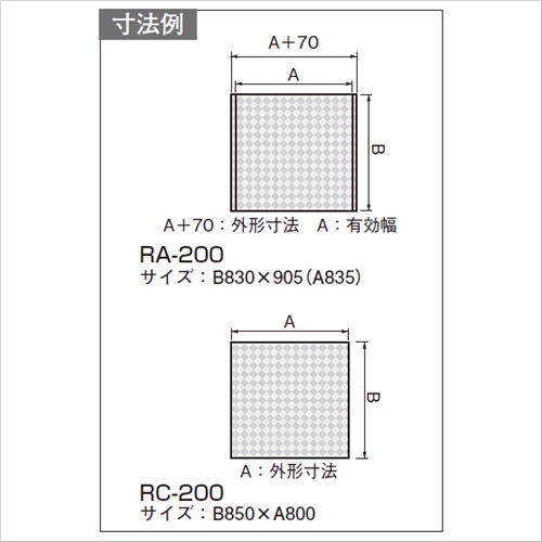 [品番/呼称]RA-400 [サイズ]横幅A835mm(外形寸法905mm)、出幅B1500mm、高さ50mm〜400mm、板厚3.5mm [重量]16.7kg [材質]アルミ [仕上げ]生地 [耐荷重]300kgf