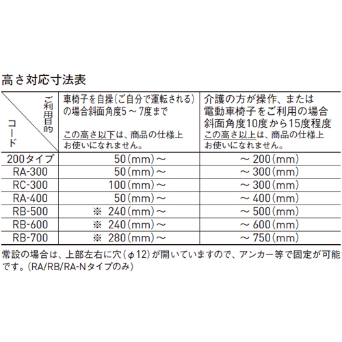 ・右表は車椅子で使用する場合の一般的な安全角度目安です。使用者の体力や車椅子の性能により若干の違いがあります。 ・車輌用としては、ご使用いただけません。 ・アルミの板厚はRA・RB・RCタイプで3.5mm。RA-N(ノンスリップ特殊塗装)タイプで3.0mm。 ・長さは有効幅です。脱輪防止側壁のあるRA、RB、RA-Nタイプの外形寸法は905mmとなります。