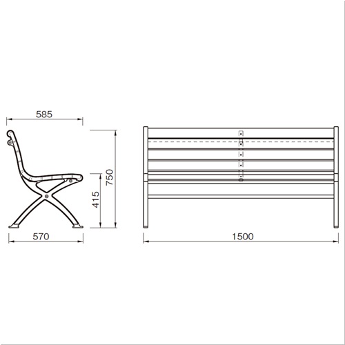・再生樹脂を使用した、落ち着いた木調カラーの樹脂製ベンチです。 ・アンカー固定用の専用金具も別途ご用意できます。 [品番/呼称]RB5-SW [サイズ]1500mm×585mm×H750mm [重量]52kg [材質]100%再生ABS樹脂・鉄鋳物 ●仕様:背付