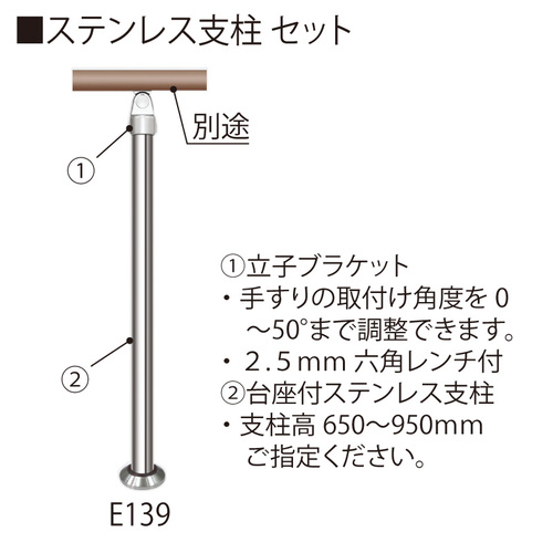 ・タイヤ付ハンドレールを後入れできるブラケットにはめ込んでネジ止めする だけなので施工が簡単です。 ・フレキシブルジョイントは自在に曲げられるので、施工現場での芯材曲げ加工やタイヤはめ込み作業が不要です。 [色]シルバー [品番/呼称]E139 [サイズ]108mm×716mm〜1016mm×Φ72mm [重量]1.3 〜 1.7kg [材質]アルミ・ステンレス [仕上げ]アクリル焼付塗装 [ご注意] ・ブラケットは取付け間隔900mm以内でご使用ください。また、端部・接続部からは150mm以内にブラケットを取付けてください。 ・ネジの締付けは確実に固定している事を十分にご確認ください。 ・色をご指定ください。 ・納期:ご確認ください。