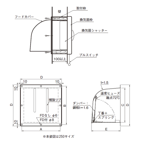 [サイズ]300x210x300mm [本体重量]4250g [材質]SUS304 [仕上]2B ●換気扇:20cm用 【ご注意】ファイヤーダンパー(FD)が作動する時、換気扇のシャッターにあたらないよう壁厚100mm以上の壁に取付けてください。バルコニー、廊下で取付け位置が低い場合は怪我防止のため、正面左右に保護用のフードカバー用ゴムパッキンをご使用ください。ゴムパッキンは防水用ではありません。ゴムパッキンは、524-835・836・837には付属されております。防虫用ネットの取付ネジはフードカバー本体に付属しています。