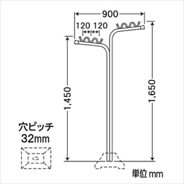[寸法]W32×D900×H1650mm [材質]フレーム:ステンレスφ32mm、パーツ:キャップ/樹脂 [重量]2.7kg [機能]竿掛け数:6