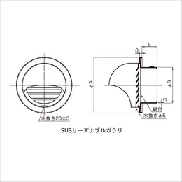 [サイズ]A:197、B:147、C:50 [重量]520g [材質]SUS304 [仕上げ]ヘアーライン [仕様]網付 [適用パイプ]エース150 152×160 [有効換気面積]116平方センチメートル