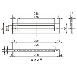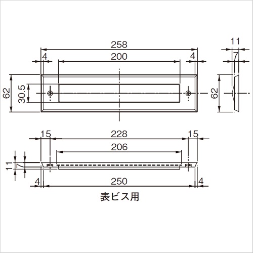 郵便物差入口にご使用いただけます。 [サイズ]外形:H62mm×W258mm、投入口:H30.5mm×W200mm [本体重量]140g [付属品]SUS 十字穴付皿木ネジ:3.8×32:2本 [材質]SUS304 [仕上]ヘアーライン