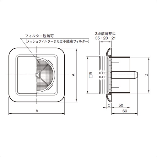 [サイズ]A:146、B:102、C:13.5、D:98 [色]クールホワイト [本体重量]128g [材質]ASA [備考]メッシュフィルター付 [適用パイプ]SU100 100×106 [有効換気面積(給気)]22.7平方センチメートル