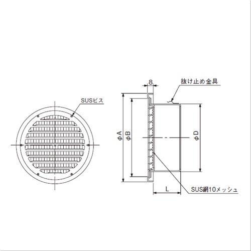 [サイズ]A:192、B:172、D:147、L:59 [重量]250g [材質]SUS304 [仕上げ]カチオン電着塗装後、ポリエステル焼付塗装(シルバー) [仕様]網付 [適用パイプ]エース150 152×160 [有効換気面積(給気)]82.9平方センチメートル
