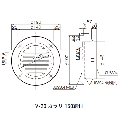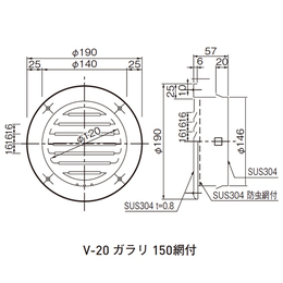 [サイズ]A:190、B:146、L:54 [重量]360g [材質]SUS304 [仕上げ]研磨 [仕様]網付 [適用パイプ]エース150 152×160 [有効換気面積]33平方センチメートル