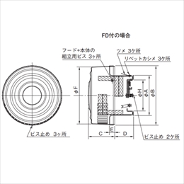 ・フードを取り外し、 中の防音材付カセットの交換が可能です。 ・防火ダンパー:公称作動温度72℃ [サイズ]A:98、B:144、C:72、D:37、E:20、F:139、H:76 [材質]アルミ [色]シルバー [適用パイプ]SU100]100×106 [有効換気面積]19.7cm2 [重量]410g ●仕様:網付、FD付