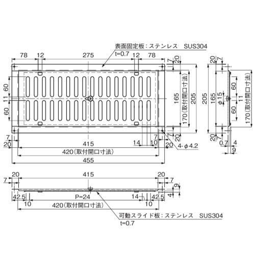 [材質]SUS304 [仕上]ヘアーライン [サイズ]H205×W455 [有効換気面積]185平方センチメートル [本体重量]840g