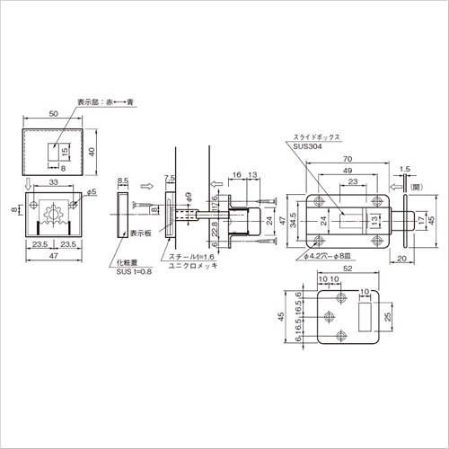 トイレの内・外開き扉用の表示付ラッチなどとしてご使用いただけます。 特殊装置により軸の回転で表示板がスライドしますので、扉にφ10の穴をあけるだけで取付けができます。 [サイズ]表記による [本体重量]200g [付属品]SUS十字穴付皿木ネジ 3.5×20:2本 3.5×25:7本 [材質]SUS304 [仕上]ヘアーライン ●扉厚:26〜40