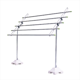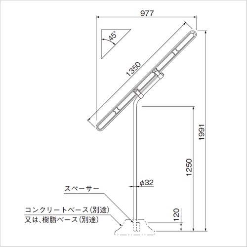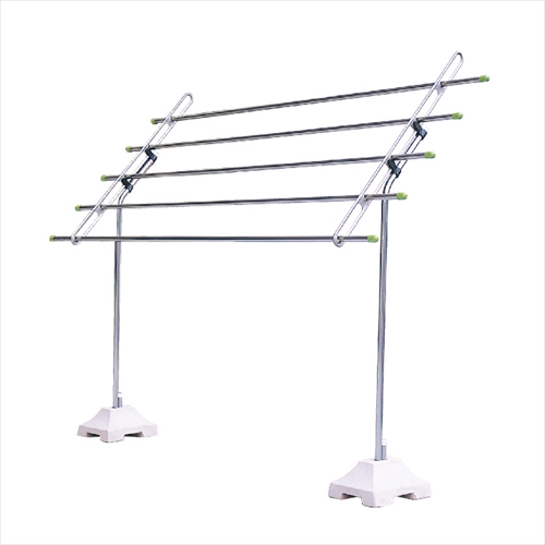 ・竿は効率のいい5本掛けで、角度があるため、洗濯物に日差しがまんべんなく当たり、乾きもスピーディです。 ・取付け位置が低いため、従来の平行物干に比べ楽に利用できます。 ・美観を損なわないシンプルなデザインです。コンクリートベースを地中に埋込めれば、一段とすっきりします。